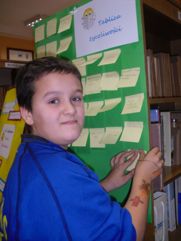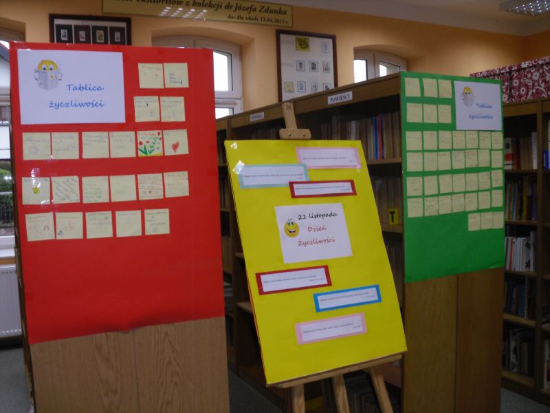 Z okazji Dnia Życzliwości, który obchodzony był 21 listopada, do biblioteki znów zawitały tłumy uczniów. Można było napisać coś miłego, pozytywnego, życzliwego , umieścić na specjalnie do tego celu przygotowanej planszy i poczęstować się cukiereczkiem oraz otrzymać uśmiechniętą buźkę do przyklejenia na szkolny mundurek .